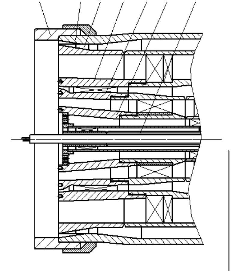 1、回转窑用煤气混烧燃烧器的喷头,其特征在于:从外到内依次设有轴流风通道、旋流风通道、煤风通道、燃气通道、中心风通道和点火通道共六通道,分别由轴流风外筒(2)、轴流风内筒(3)、煤风内筒(4)、旋流风内筒(5)、煤气内筒(6)、点火管道(7)由外到内依次同轴套装后形成;轴流风外筒(2)、轴流风内筒(3)、煤风内筒(4)、旋流风内筒(5)、煤气内筒(6)均为圆筒状且管径依次减小;轴流风外筒(2)与轴流风内筒(3)套装后构成的空腔为轴流风通道,轴流风内筒(3)与煤风内筒(4)套装后构成的空腔为旋流风通道,煤风内筒(4)与旋流风内筒(5)套装后构成的空腔为煤风通道,旋流风内筒(5)与煤气内筒(6)套装后构成的空腔为燃气通道,煤气内筒(6)与点火管道(7)套装后构成的空腔为中心风通道,点火管道(7)的内筒空间构成点火通道。