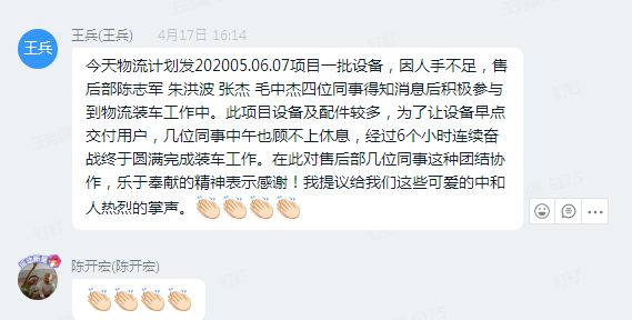 4月中旬,由于物流发货量大,财务部发货人员又碰巧离职。王兵一人力量有限,其反映困难后,售后部门一呼百应。此次协助物流发车,作为被协助部门,我们深表感谢!同时也让我们真切的看到公司各部门的相互协作与无私帮助,这是中和这个大家庭带给我们的温暖。