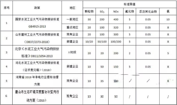 随着全球经经济的发展,人们对环保要求的重视和提高,水泥工业废气对氮氧化物排放的限值也日益严格。《水泥工业大气污染物排放标准-GB 4915-2013》中重点行业的排放标准规定:氮氧化物(以NO2计)排放值为≤320mg/Nm3,个别地区的标准已经远远低于了这个标准,详见表1。
