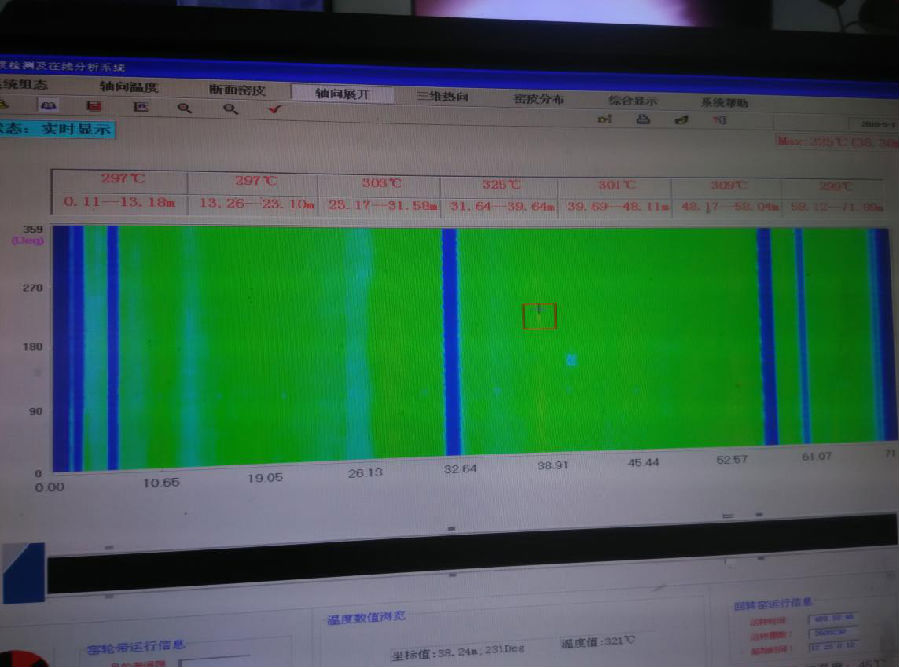 燃烧器更换前后窑皮情况:更换前主窑皮偏短(21m),不平整,40m~45 m易结副窑皮,更换后主窑皮长度26m(有所延长),平整度好,40~45 m无副窑皮,窑皮筒体扫描见图8。