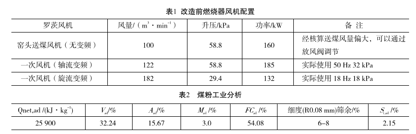 阳泉薰东水泥有限责任公司(以下简称阳泉冀东)现有一条4500td预分解窑水泥生产线,回转窑规格中4.8m×74m,双系列预热器帯管道式分解炉系统,回转窑使用某公司的煤粉燃烧器,现场风机配置如表1。