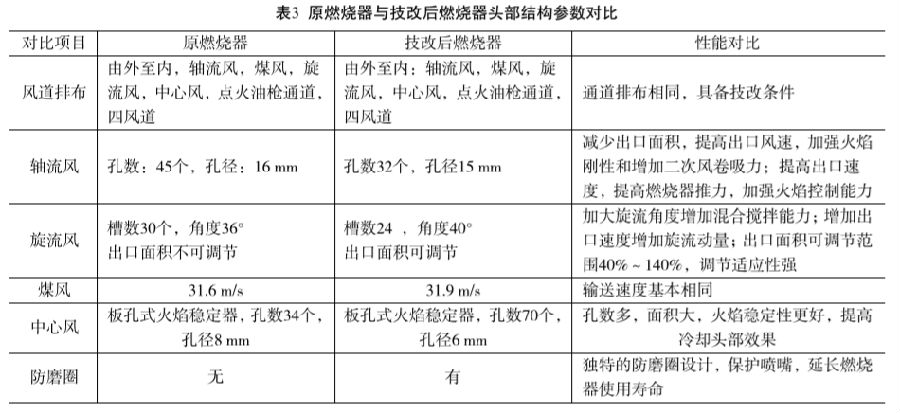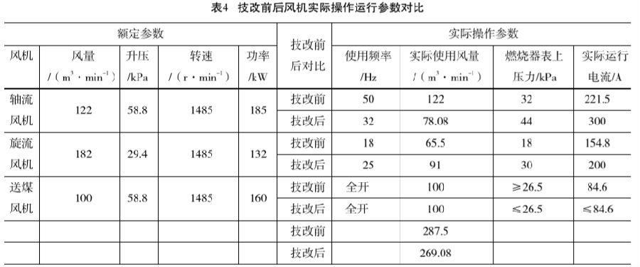 技改后仍然保持原有双风机(轴流风和旋流风)和送煤风机不变,仅仅只是改进了头部的出口面积,改变了风量,风速及旋流角度,以及各参娄之间的匹配设计,通过增加风速增加燃烧器整体推力,增加旋流角度加强煤粉与助燃风及二次热风的混合,提高煤粉的燃烧效率和火力强度。从表4可看出,技改后整体实际用风量比技改前略为降低,充分利用了现场设备资源,发挥出了应有的效益。
