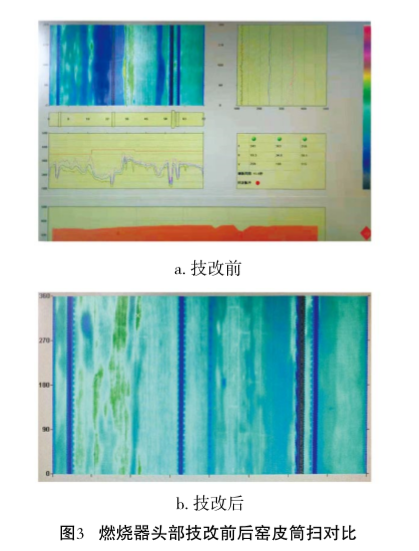 经过三个月的生产实践,窑系统运行稳定,游离钙合格率提高,熟料强度提高1.5MPa,吨熟料标煤耗下降2kg。熟料结粒基本均齐致密,无严重分级现象,二次风温提高约50℃。主窑皮长度适宜,没有出现结副厚審皮现象,解决了易结圈的问题。燃烧器头部技改前后熟料产质量对比见表5,燃烧器头部技改前后窑皮筒扫对比见图3,等问题的目的,各项指标优于原燃烧器,技改是成功的。本次技改,可谓小技改,大收益。不足之处,送煤风机风量以及管道直径偏大,一次风机与技改后的燃烧器不匹配,总体一次风实际使用量还是偏多,风机电流偏大,还有进一步优化提升空间